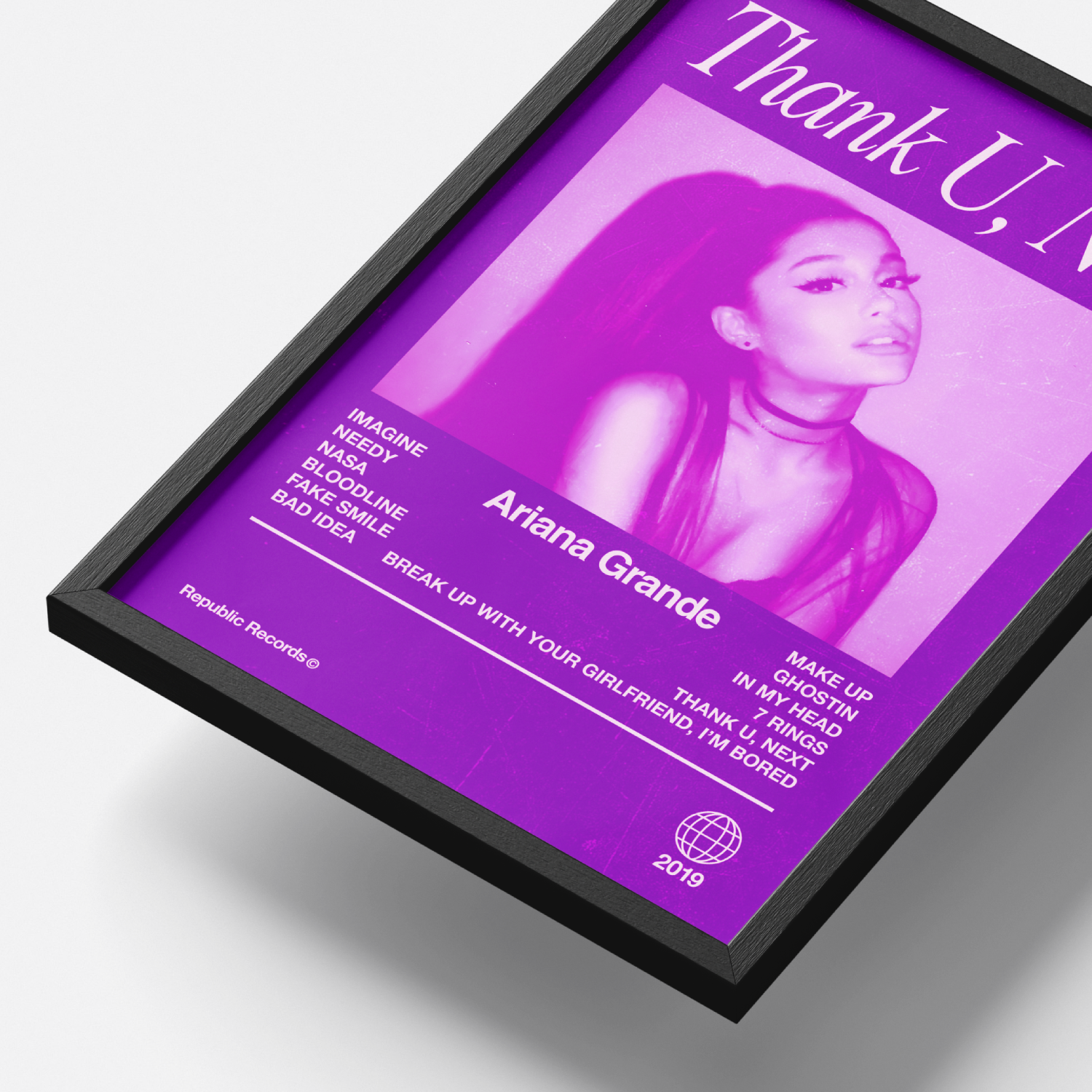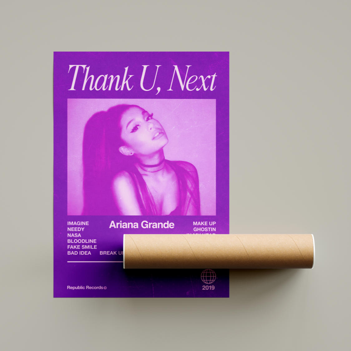 Add a touch of pop royalty to your space with this Ariana Grande 'Thank U, Next' Album Poster. Featuring the iconic album artwork and complete tracklist, this poster celebrates the empowering anthems and heartfelt ballads that defined a generation. From "7 rings" to "thank u, next," every track reflects Ariana’s signature style and emotional depth.
