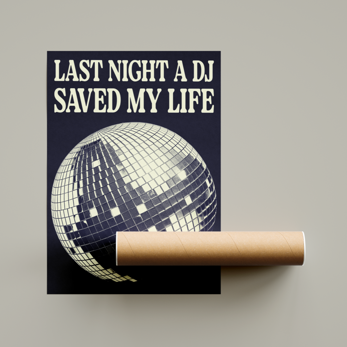 Bring the groove to your walls with this vibrant disco ball poster, featuring the iconic phrase: “Last Night a DJ Saved My Life.” Inspired by retro dance floors and classic club culture, this funky print is the perfect way to add a splash of nostalgia and rhythm to your decor.