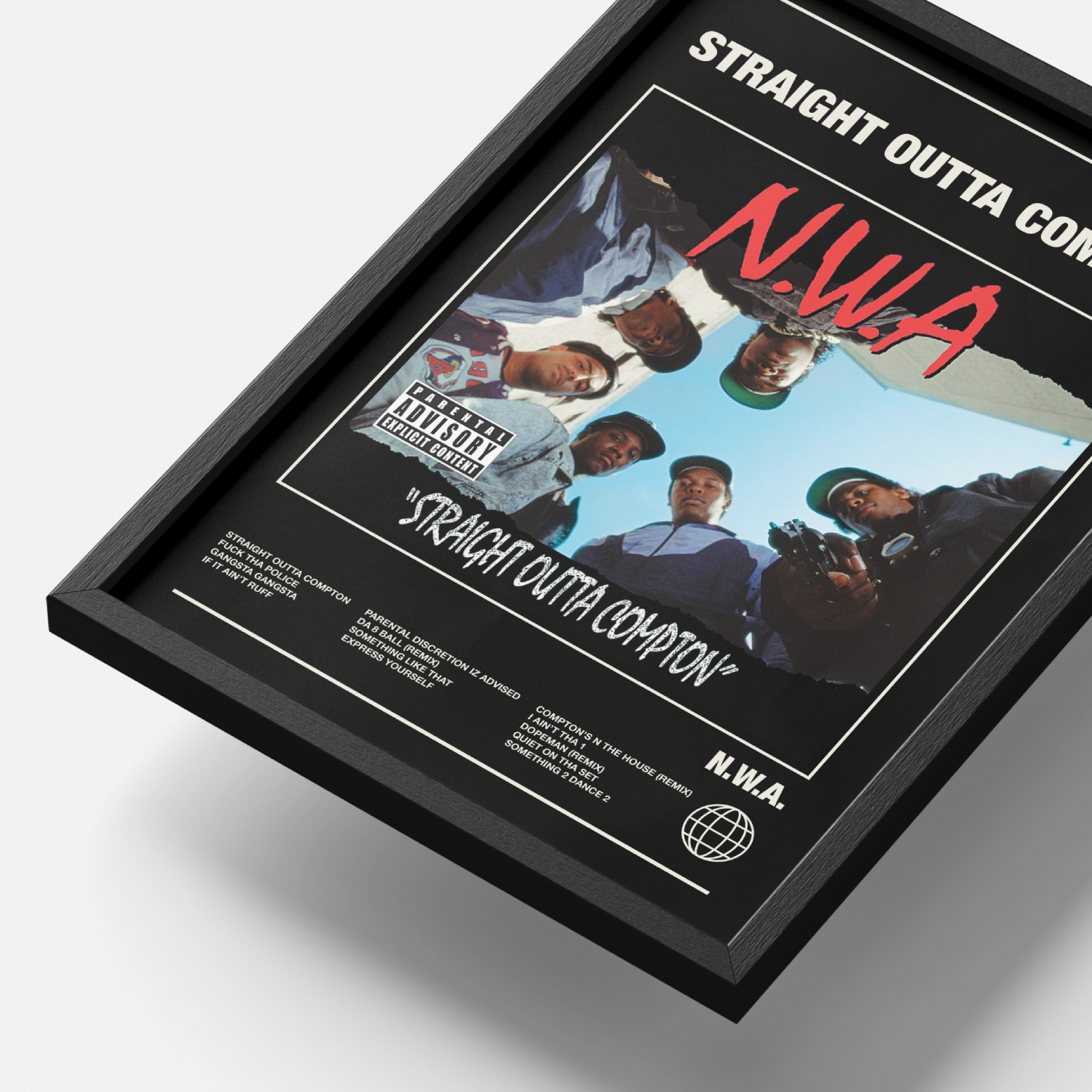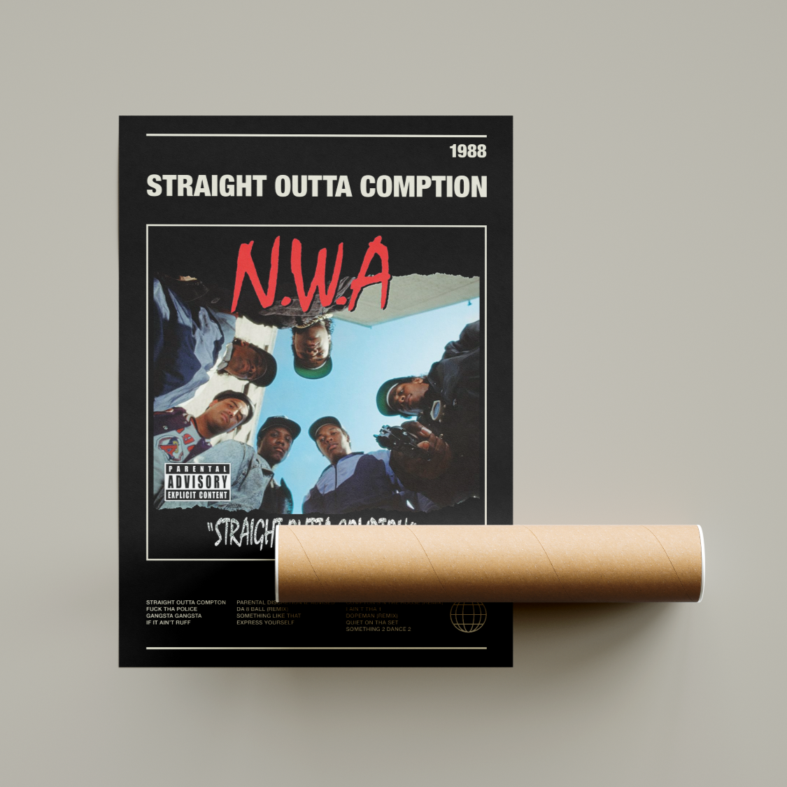 Own a piece of hip-hop history with this N.W.A 'Straight Outta Compton' Album Poster. Featuring the legendary album cover and full tracklist, this poster captures the raw power and revolutionary spirit that changed the music world forever. From "Straight Outta Compton" to "Express Yourself," every track is a testament to N.W.A’s groundbreaking influence.